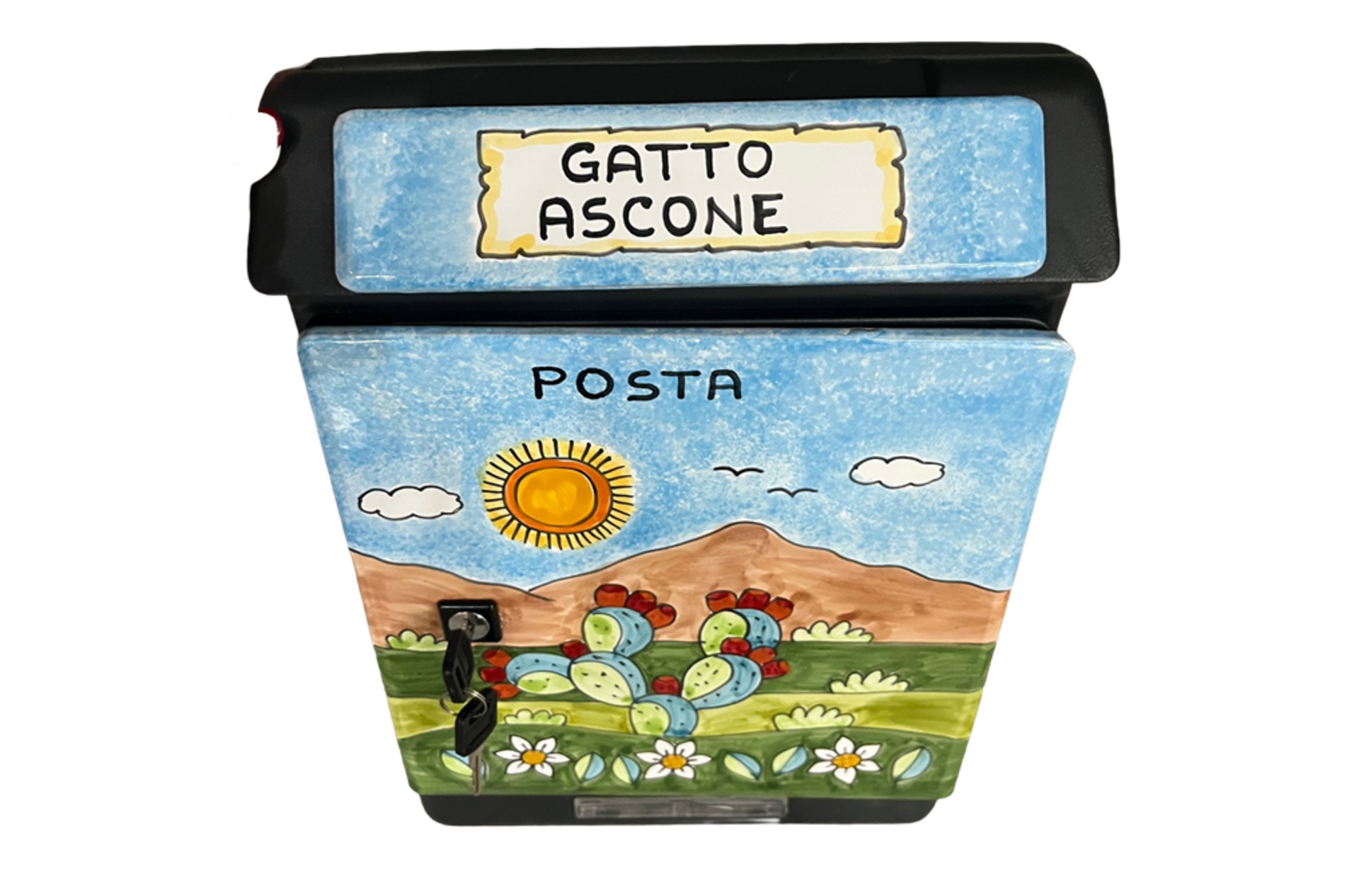 la prima superiore in formato cm.5x20 contiene i cognomi o qualunque scritta vorrete realizzare (anche per attività), mentre la seconda piastrella è quella che decora la cassetta postale e solitamente ha decoro: Pale di fichi d'india con montagna e margherite nel prato.