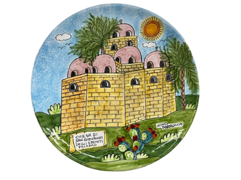 Piatto in ceramica totalmente disegnato e dipinto a mano a marchio Nino Parrucca che raffigura la Chiesa di San Giovanni degli Eremiti, monumento facente parte del patrimonio dell'umanità UNESCO è situata nel cuore di Palermo ed è uno dei simboli più affascinanti dell’architettura arabo-normanna in Sicilia.