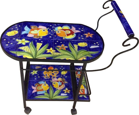 Il carrello è composto da piastrelle in ceramica realizzate, disegnate e decorate interamente a mano. Ogni mattonella è un'opera unica che dona colore e carattere, rendendo la superficie non solo un piano d'appoggio, ma un vero elemento artistico.
