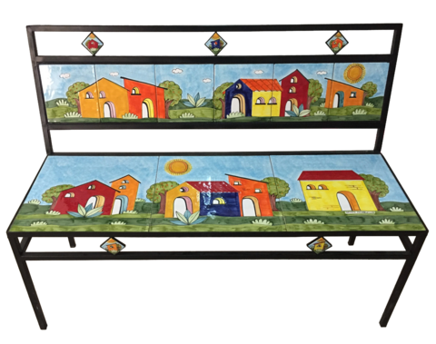 Panchina da tre posti cm.120x40x90 in ferro battuto zincato lavorato a mano e piastrelle in ceramica disegnate e colorate a mano.