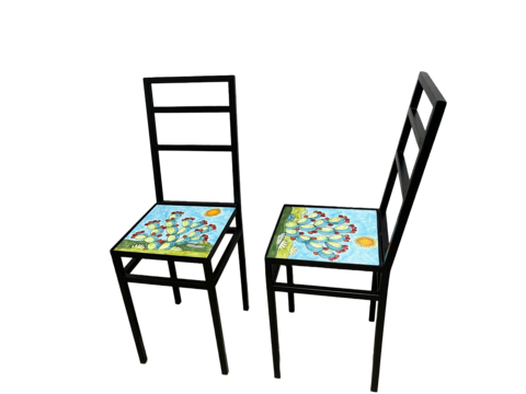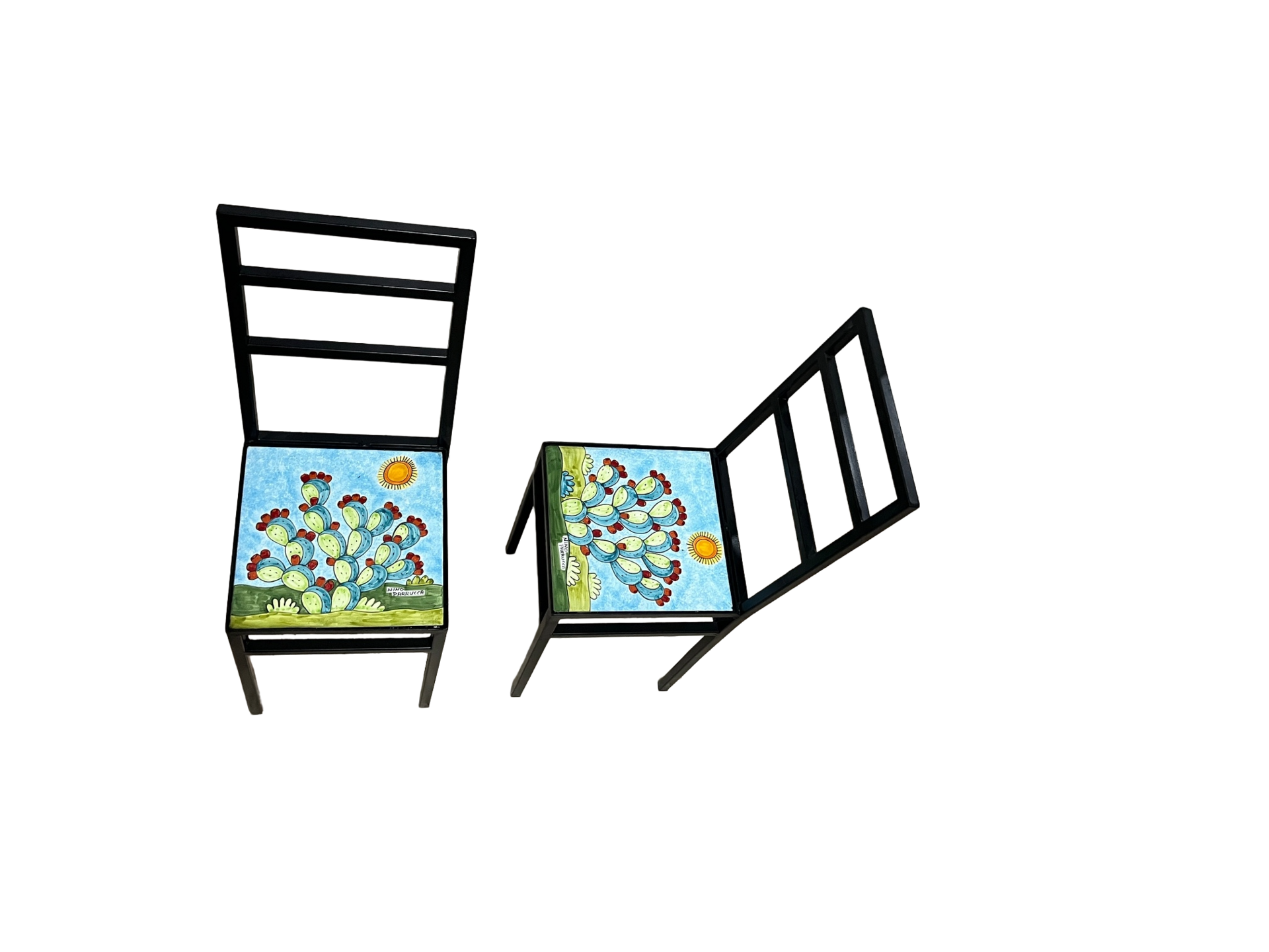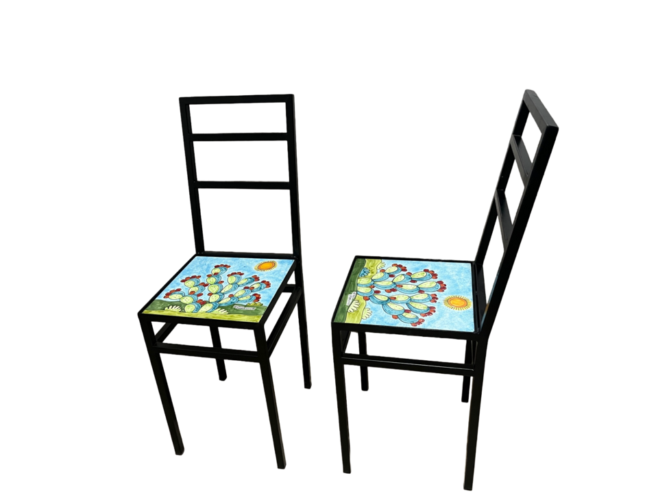 Sedia con seduta in ceramica dipinta a mano con un inconfondibile decoro Nino Parrucca: Pale di fichi d'india