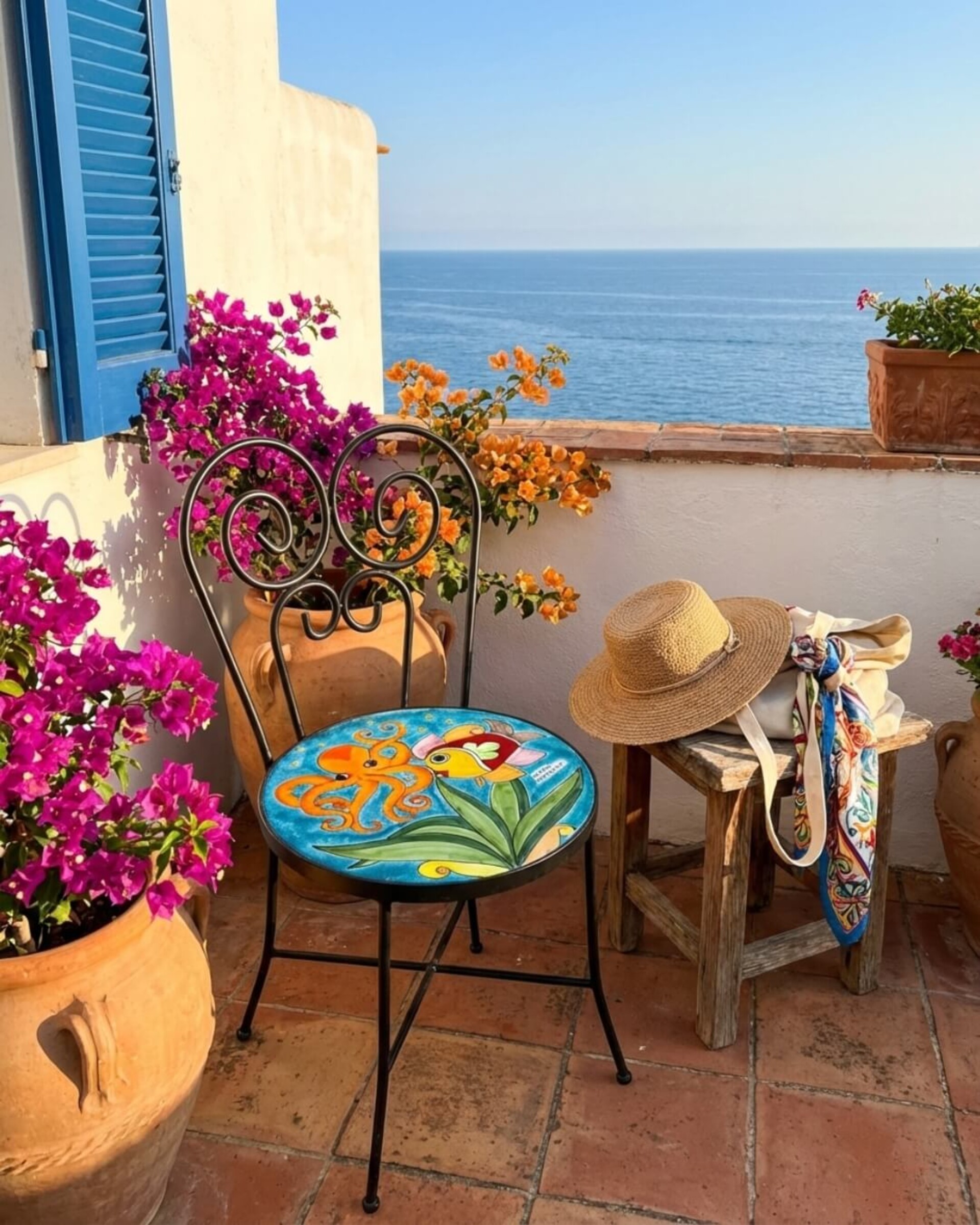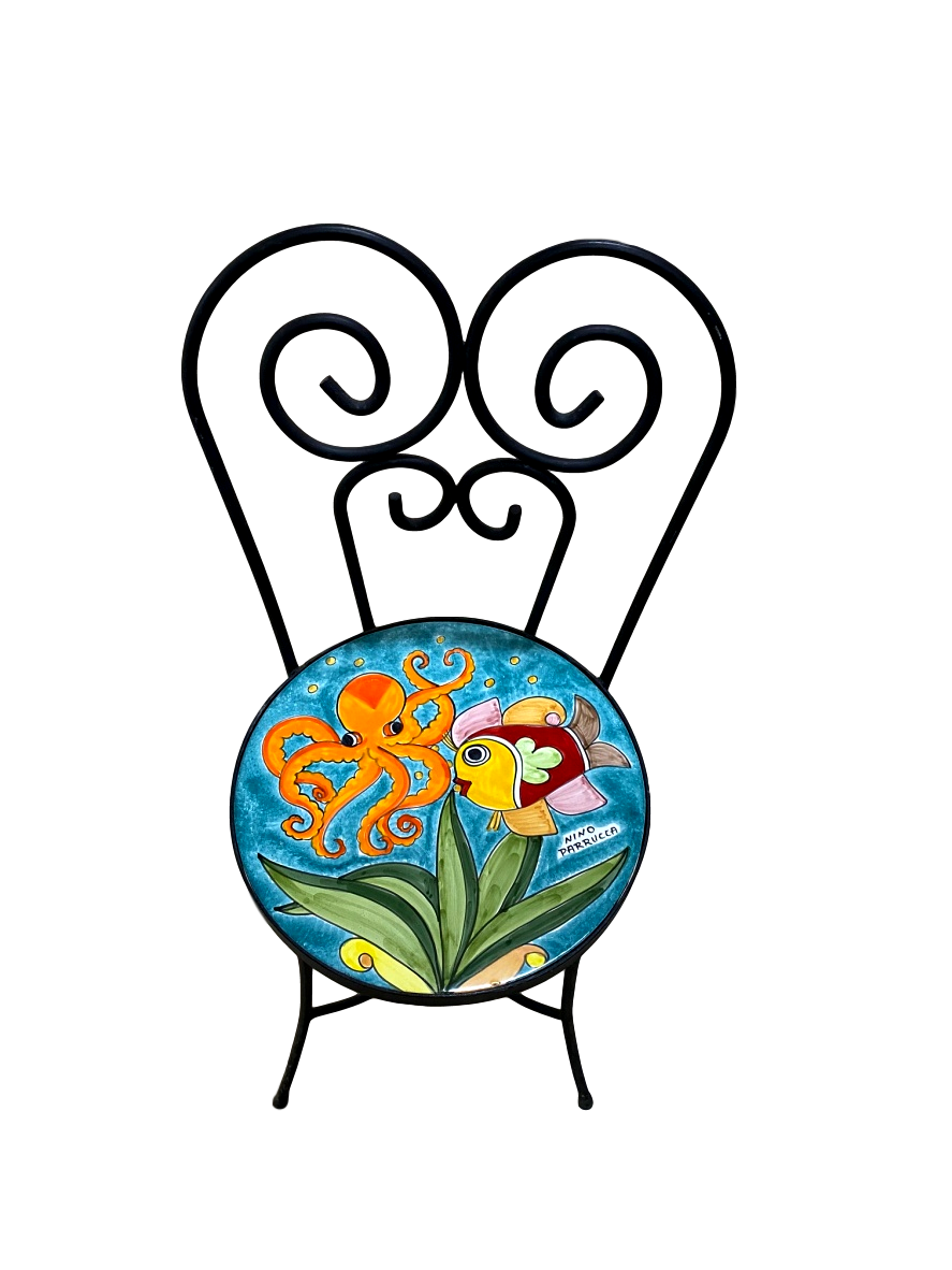 Sedia con seduta in ceramica dipinta a mano con un inconfondibile decoro Nino Parrucca: fondale marino assortito verde smeraldo