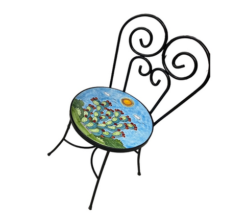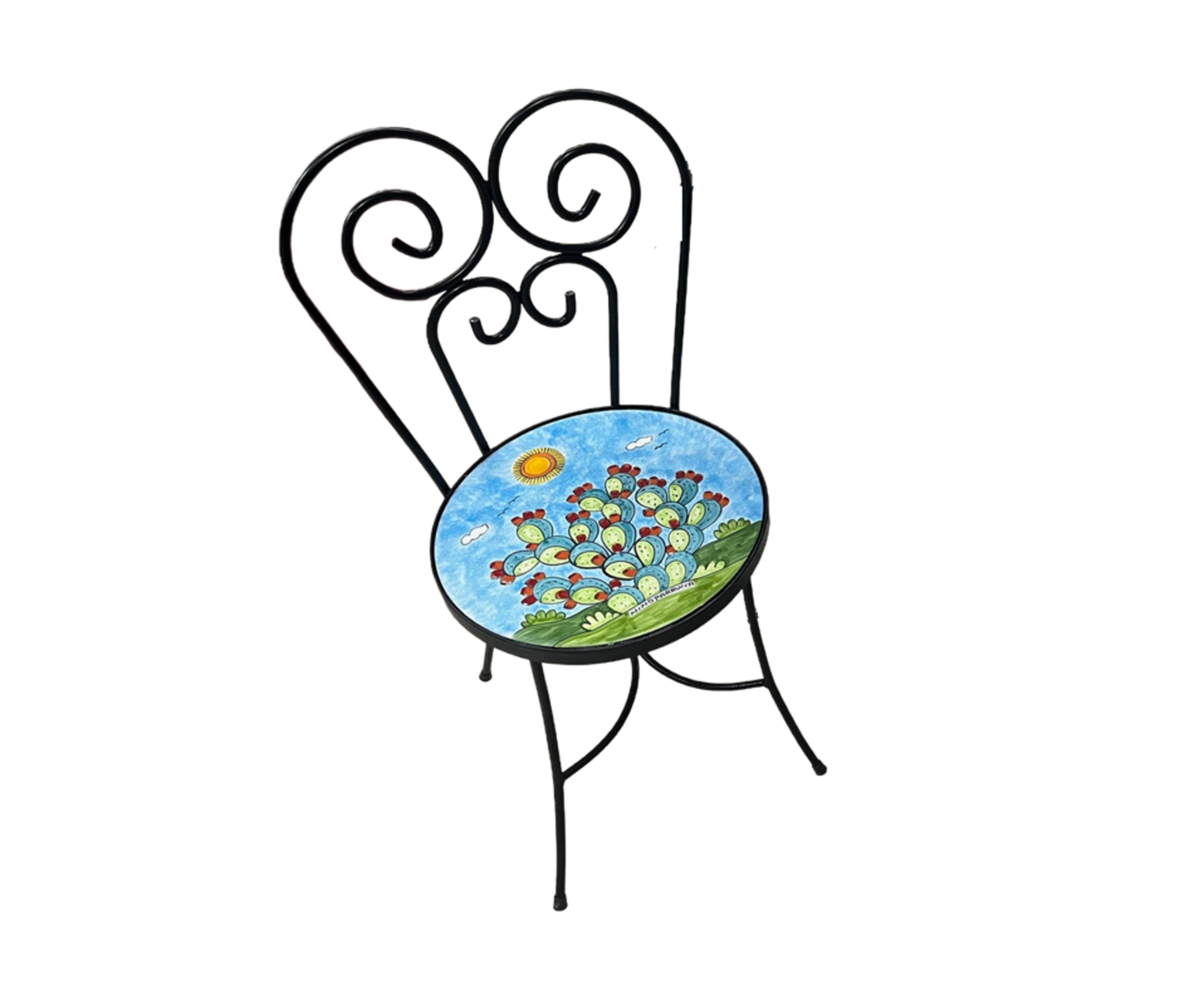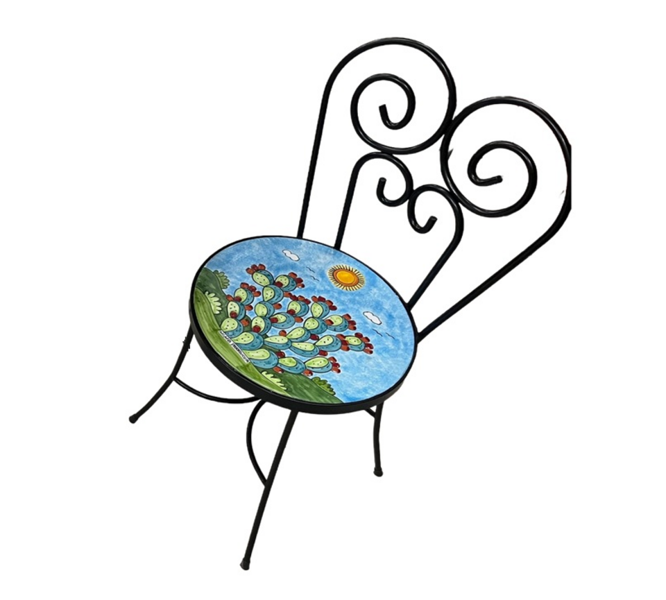 Sedia con seduta in ceramica dipinta a mano con un inconfondibile decoro Nino Parrucca: Pale di Fichi d'india fondo celeste