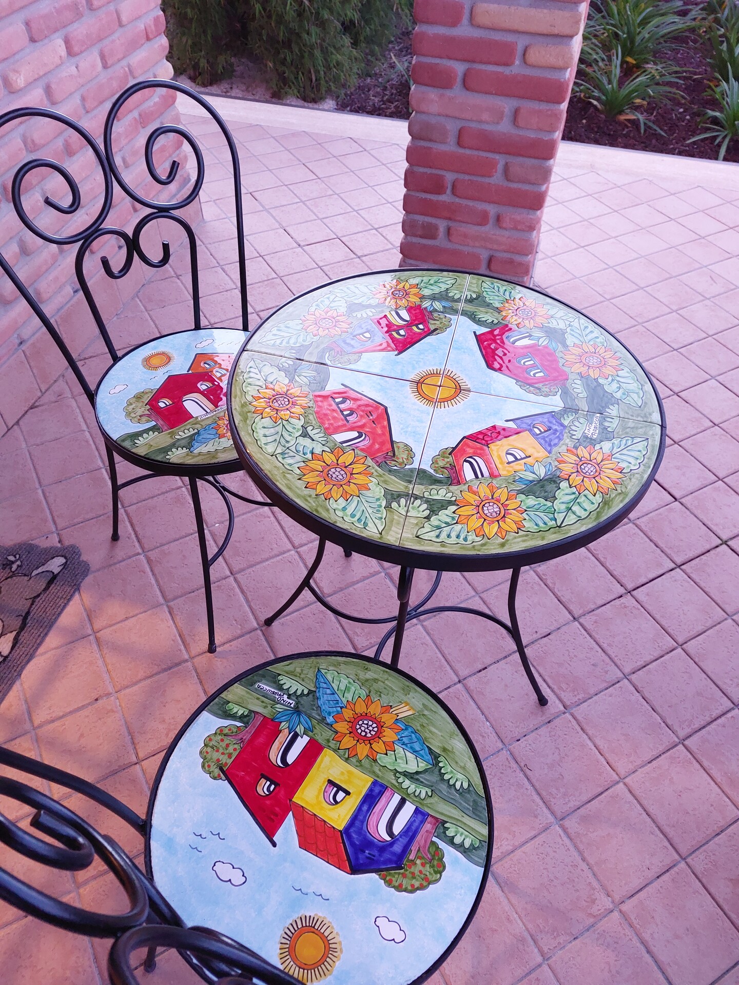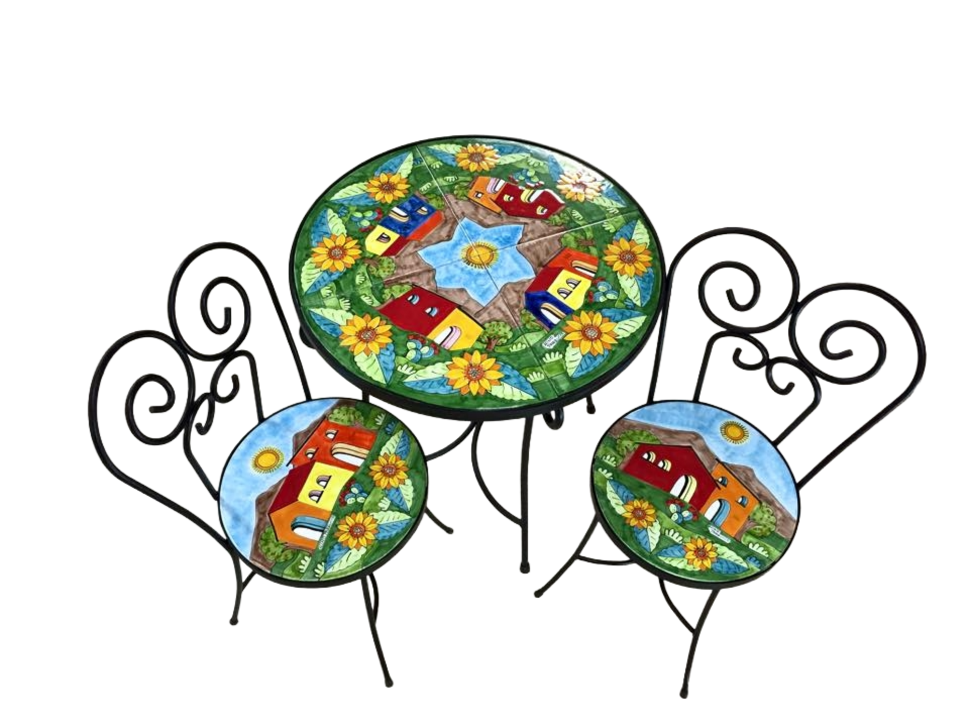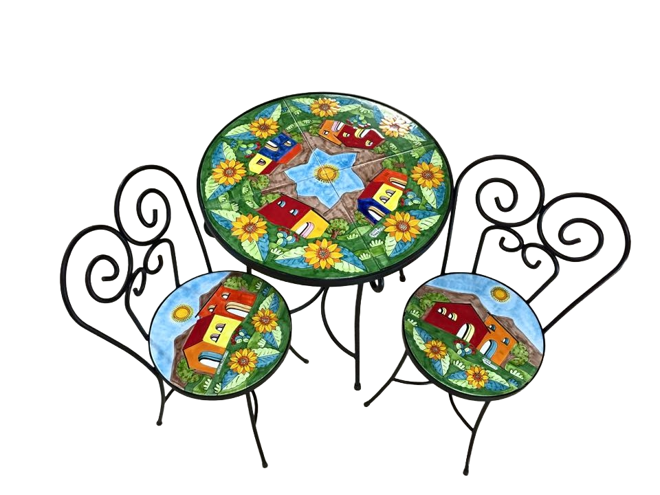 Set 3 pz in ferro battuto lavorato a mano e ceramica disegnata e dipinta a mano con decoro: paesaggio di casette con girasoli su prato, composto da:
