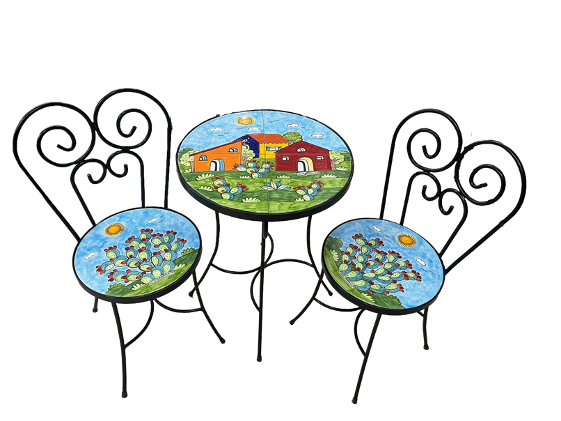 Set da giardino composto da tavolo e n. 2 sedie in ceramica dipinta a mano, con un inconfondibile decoro Nino Parrucca: paesaggio di casette con pale di fichi d'india.