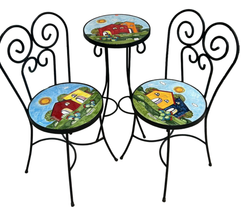 Set 3 pz in ferro battuto lavorato a mano e ceramica disegnata e dipinta a mano con decoro: Paesaggio di casette con mare blu