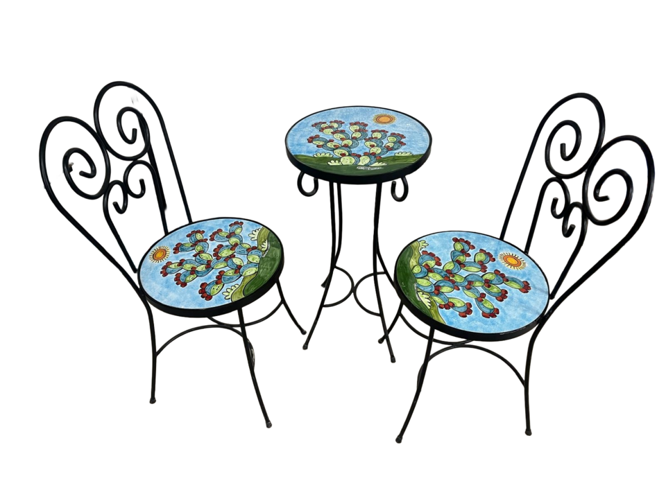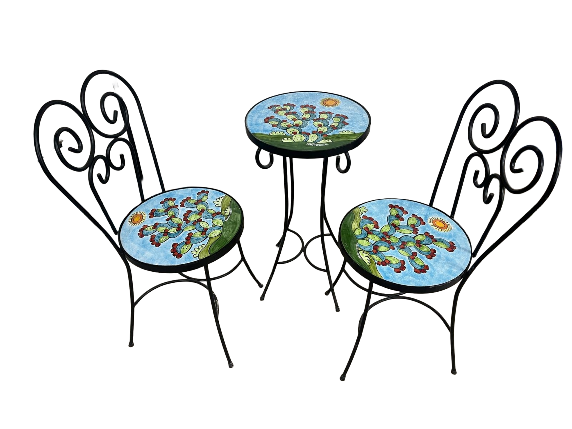Set 3 pz in ferro battuto lavorato a mano e ceramica disegnata e dipinta a mano con decoro: Pale di fichi d'india