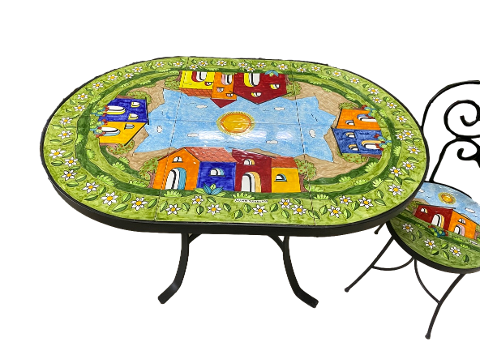 Tavolo cm.122x82 h.cm.77 in ferro battuto pieno lavorato a mano e ceramica disegnata e dipinta a mano con decoro: pPaesaggio di casette con margherite bianche sul prato
