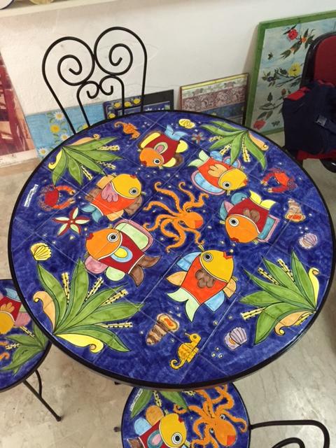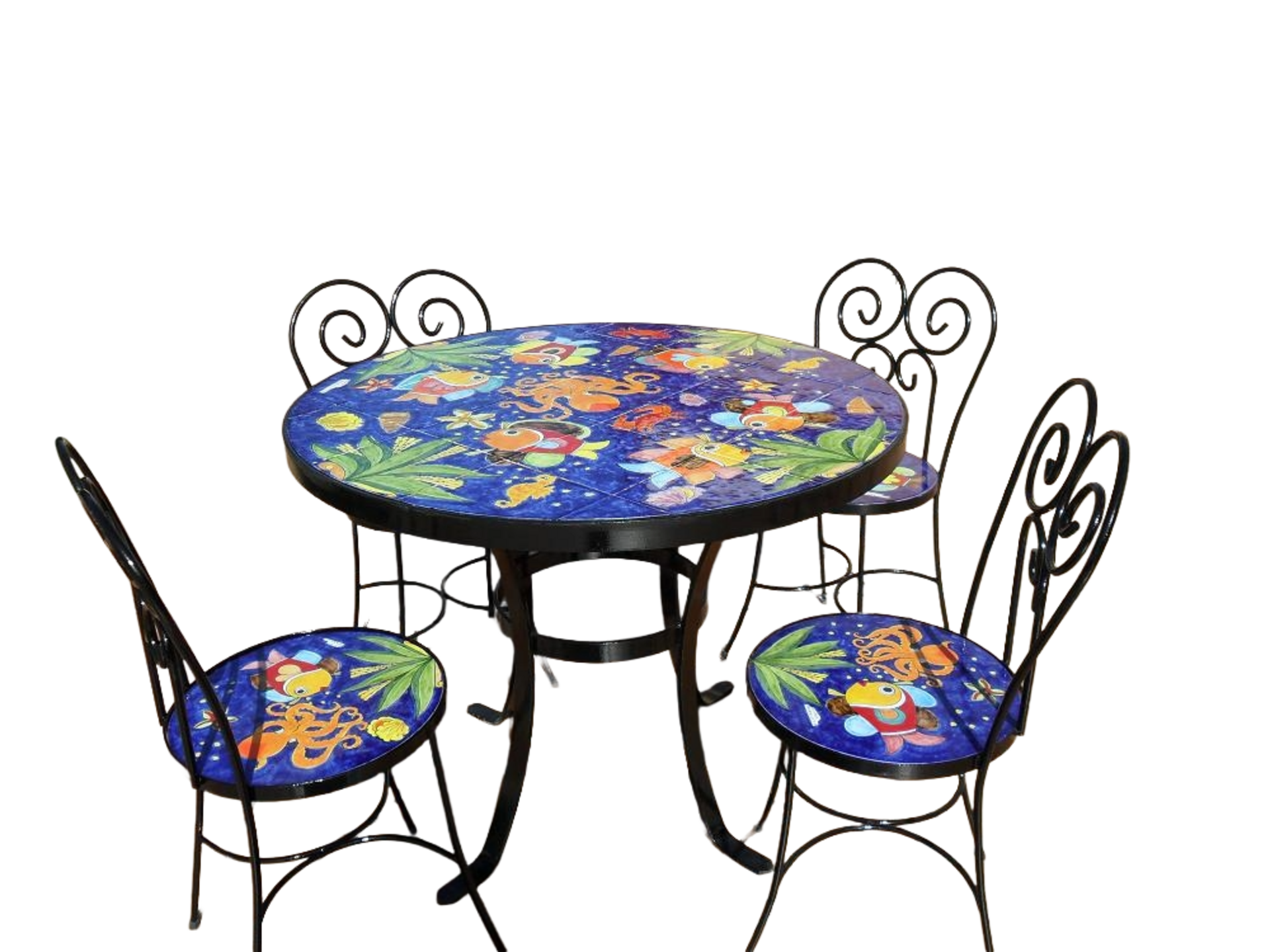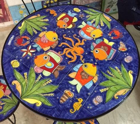 Tavolo rotondo in ferro battuto e piano in ceramica dipinta a mano con un inconfondibile decoro Nino Parrucca: Fondale marino blu