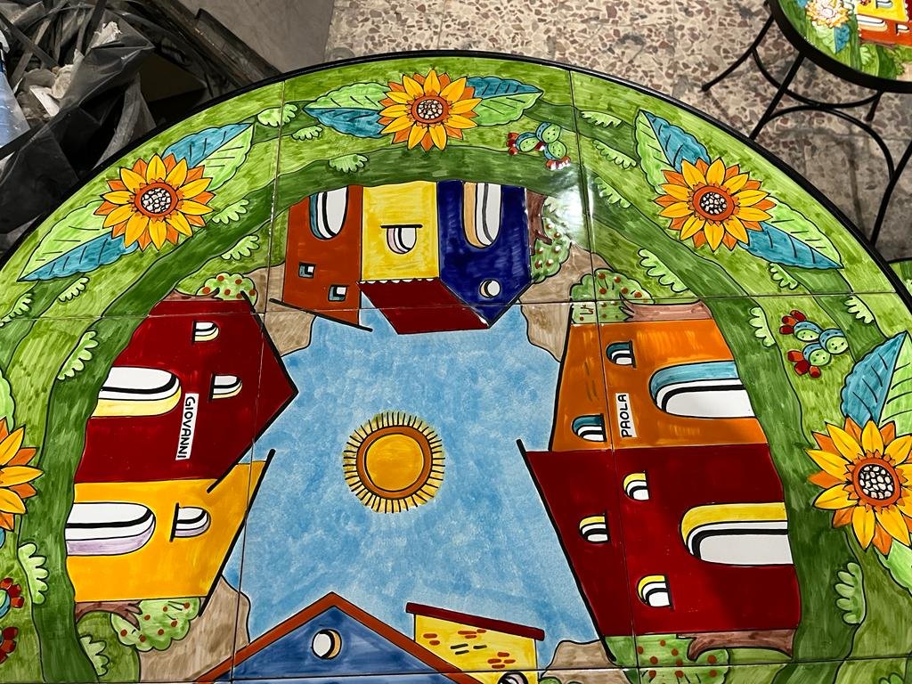 Tavolo rotondo in ferro battuto e piano in ceramica dipinta a mano con un inconfondibile decoro Nino Parrucca: Paesaggio di casette con girasoli nel prato.