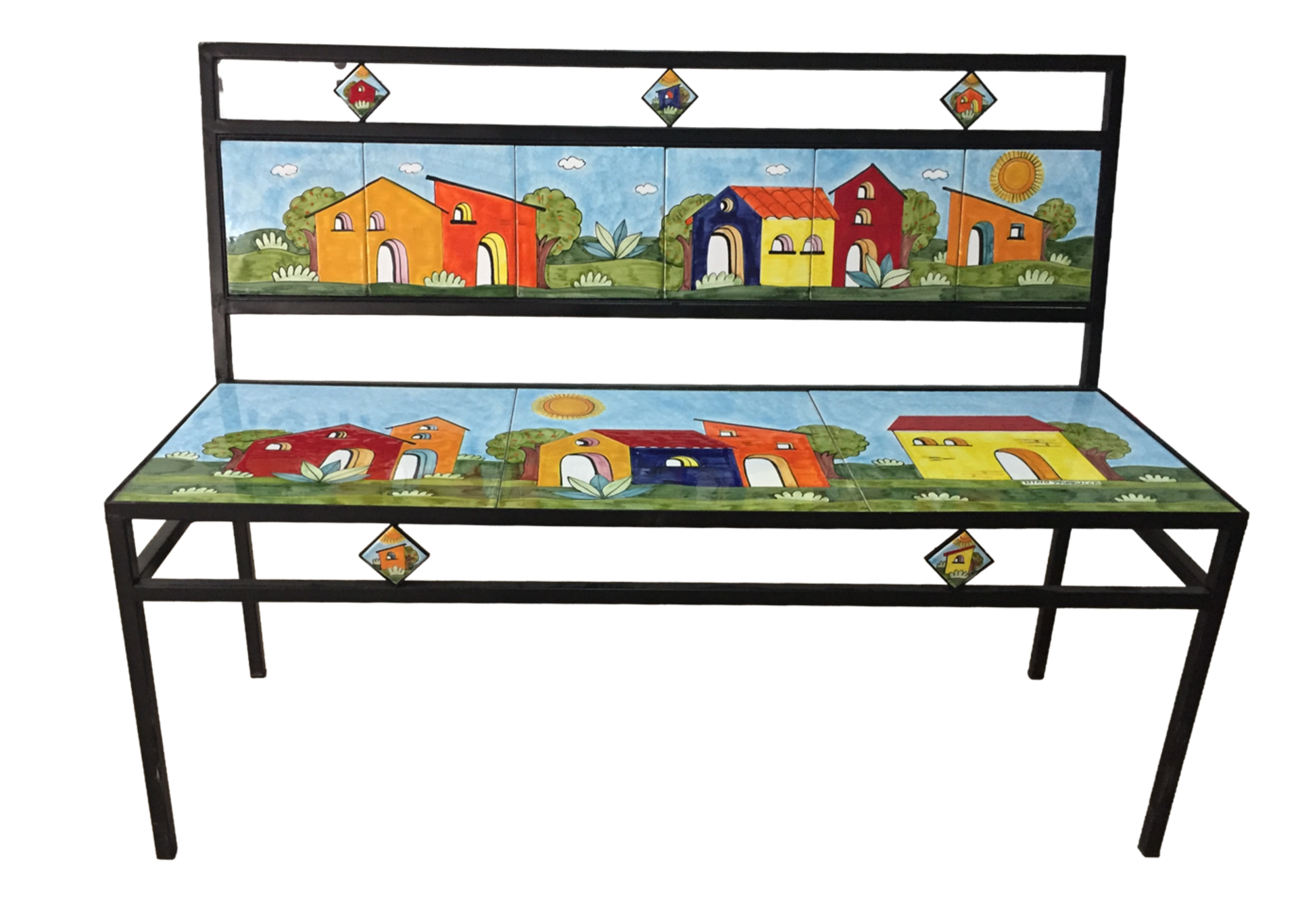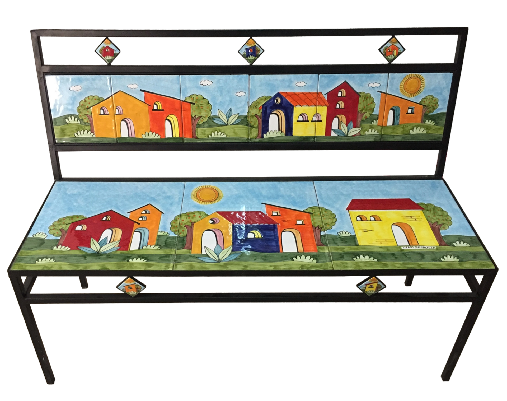 Panchina da tre posti cm.120x40x90 in ferro battuto zincato lavorato a mano e piastrelle in ceramica disegnate e colorate a mano.